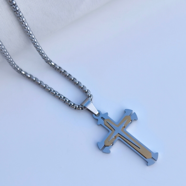 گردنبند صلیب دو رنگ استیل همراه زنجیر ویتالی