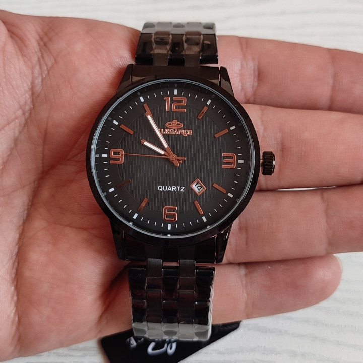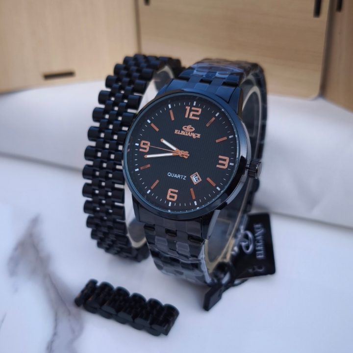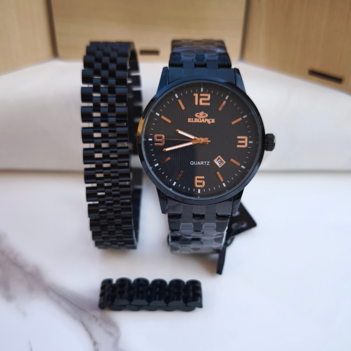 ساعت این مجموعه با موتور با کیفیت و قابلیت روزشمار ، عملکرد دقیق و حرفهای را ارائه میدهد. بند استیل توپر پیندار با رنگ ثابت و قفل متصل , مقاومت بالایی در برابر رطوبت و تعریق دارد و در استفاده روزمره یا رسمی، درخشش خود را حفظ میکند.