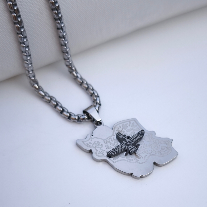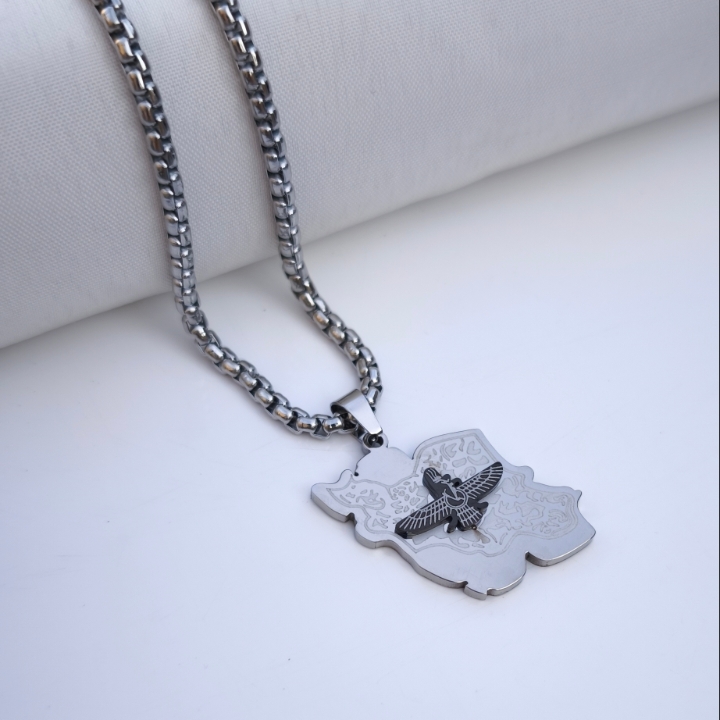 گردنبند نقشه ایران با نشان فروهر نقره ای استیل همراه زنجیر ویتالی