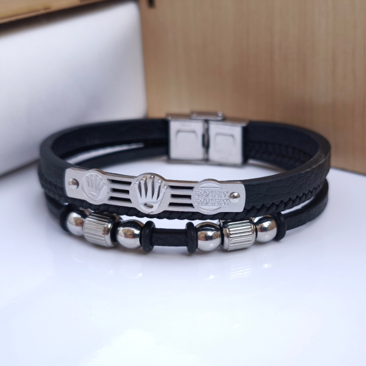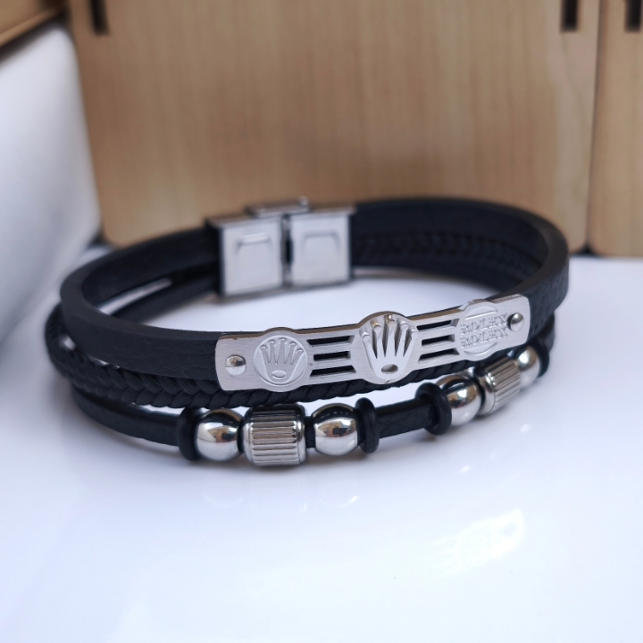 دستبند مردانه رولکس چرمی سه دور پلاک نقره ای