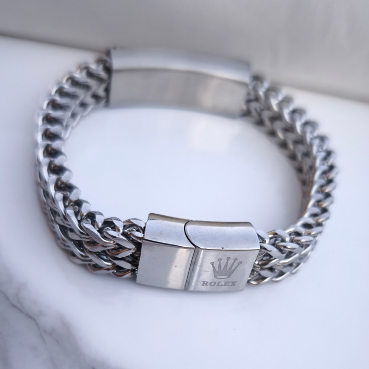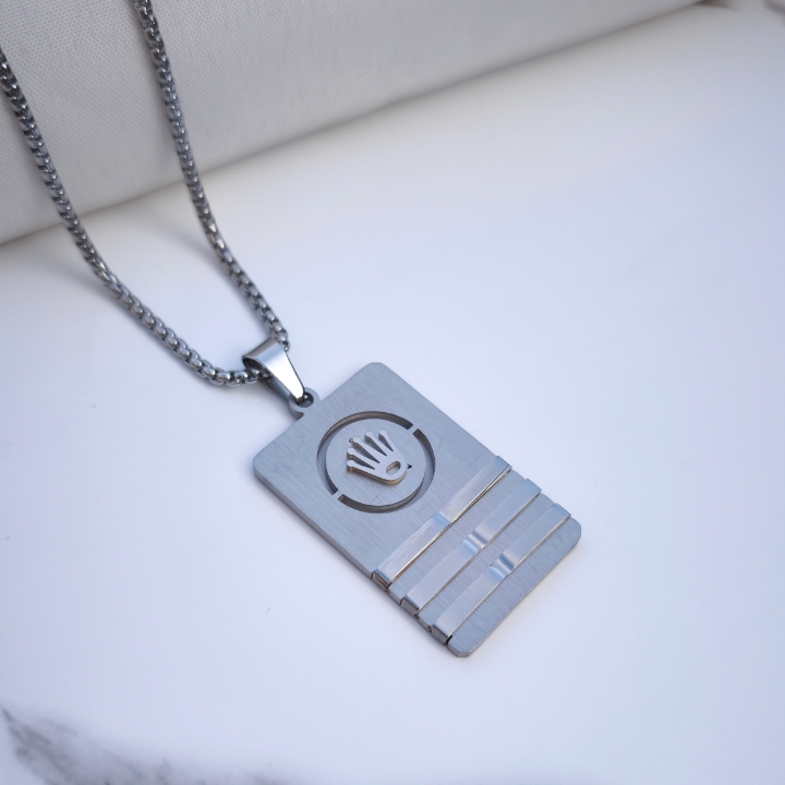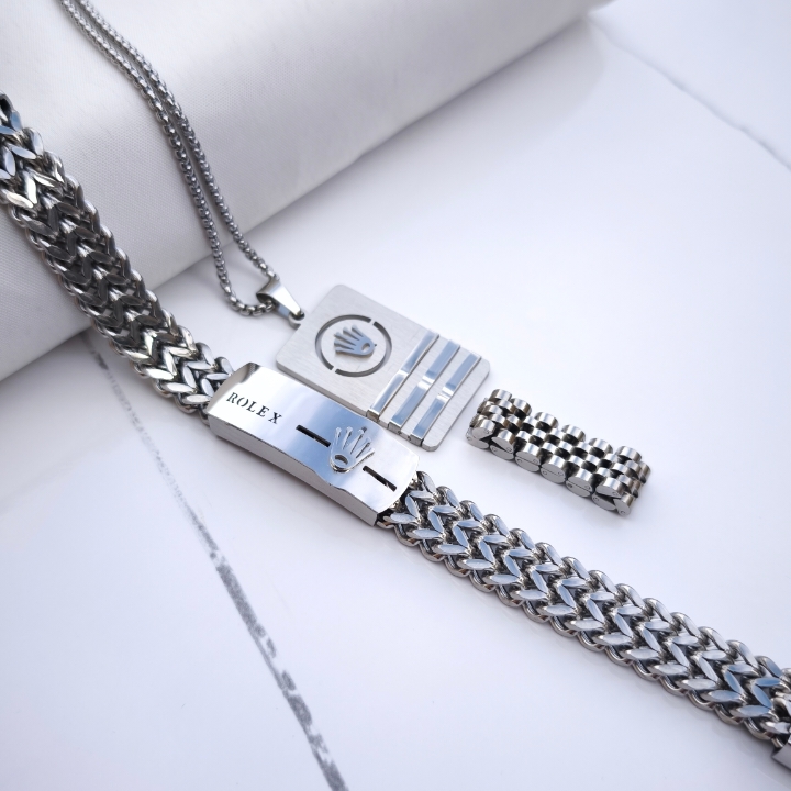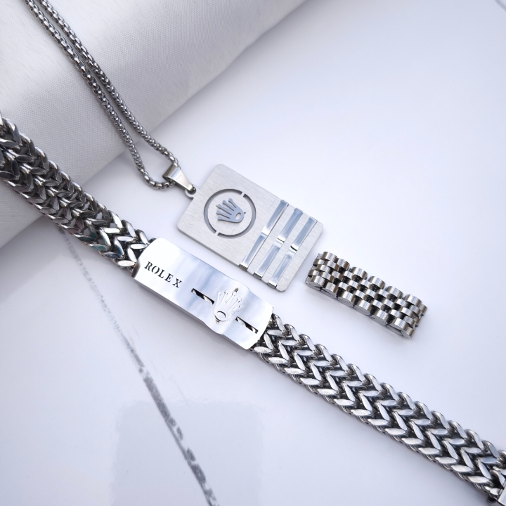 ست گردنبند دستبند و انگشتر مردانه رولکس استیل رنگ ثابت نقره ای