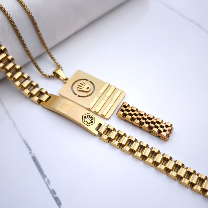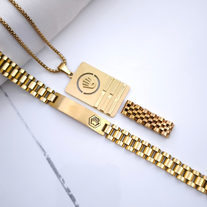 ست گردنبند دستبند و انگشتر مردانه رولکس استیل رنگ ثابت طلایی
