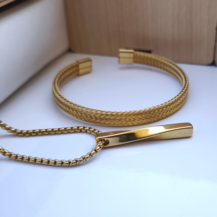 اگر دنبال یه ست شیک و خاص برای تکمیل استایل مردونهت هستی، این ست گردنبند و دستبند استیل با آبکاری طلایی دقیقاً همون چیزیه که میخوای!
