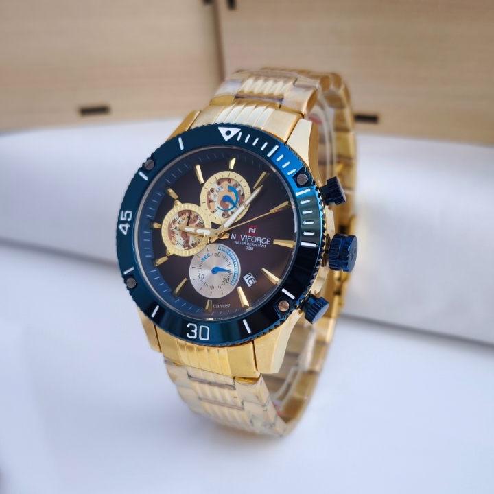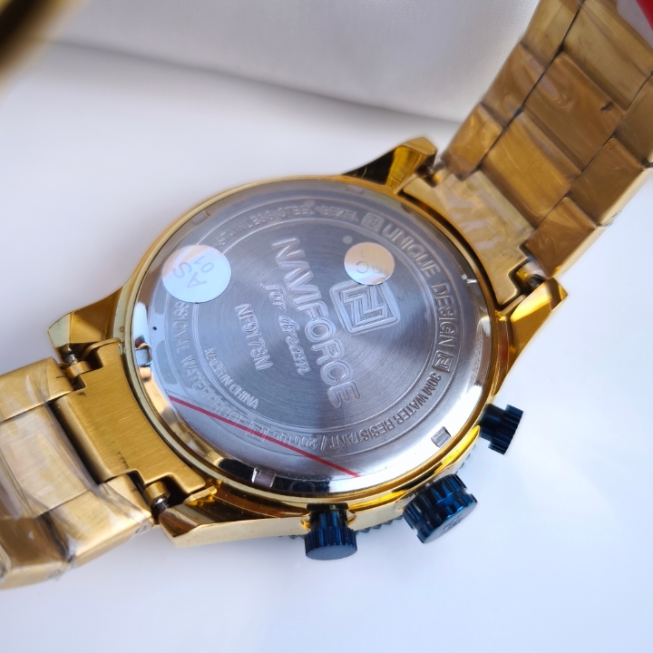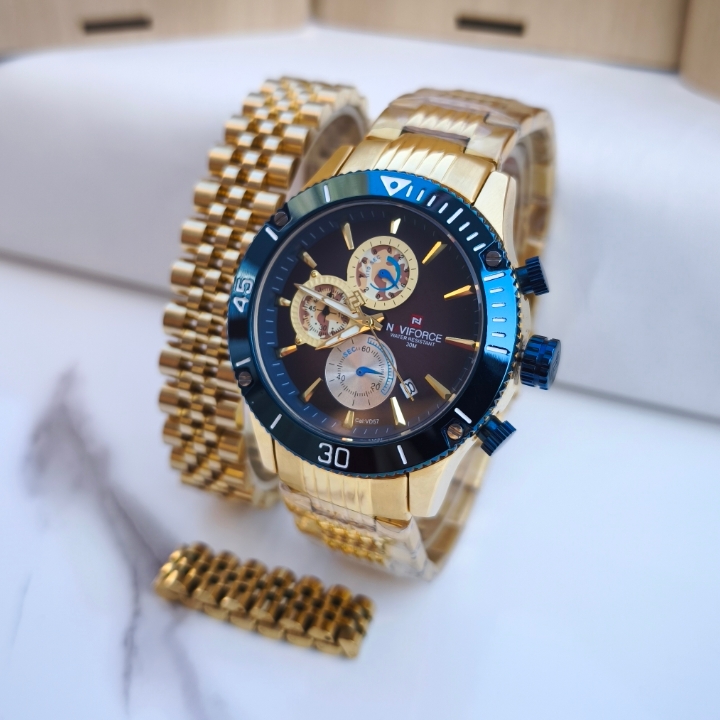 ست ساعت دستبند انگشتر مردانه طلایی استیل نیوی فورس